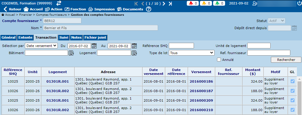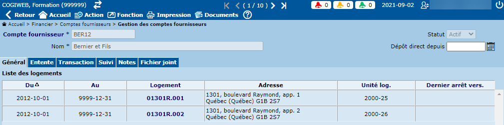 L'onglet "Général" présente la liste des logements du fournisseur pour lesquels des versements sont ou ont été effectués.