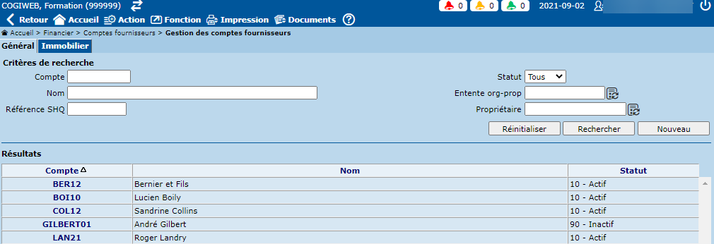 Il est possible de rechercher un compte fournisseur selon divers critères sous "Financier -> Comptes fournisseurs -> Gestion des comptes fournisseurs". L'onglet "Immobilier" permet de rechercher un compte fournisseur par ensemble immobilier, bâtiment, sous-bâtiment ou logement.