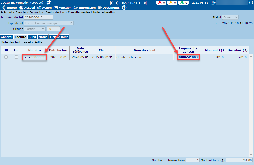 L'onglet "Facture" présente la liste des factures et crédits associés au lot de facturation. Il est possible d'ouvrir une facture en cliquant sur le numéro de celle-ci. De plus, il est possible d'ouvrir le logement ou le contrat de stationnement associé à la facture en cliquant sur le numéro de celui-ci.