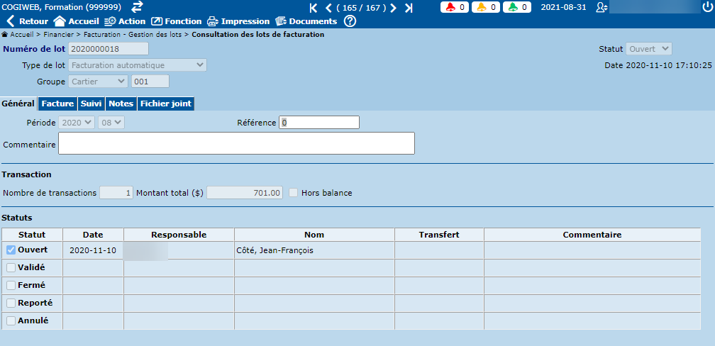 L'écran "Consultation des lots de facturation" permet de créer, modifier et consulter les lots de facturation. Pour être en mesure de modifier un lot manuel de facturation, aucune transaction ne doit être inscrite dans celui-ci. En ce qui concerne les lots automatiques (créés lors de la facturation automatique, par exemple), ceux-ci ne peuvent être modifiés en aucun cas. Bien que les lots de facturation soient créés automatiquement, l'écran "Consultation des lots de facturation" permet tout de même de créer des lots de facturation, si nécessaire.
