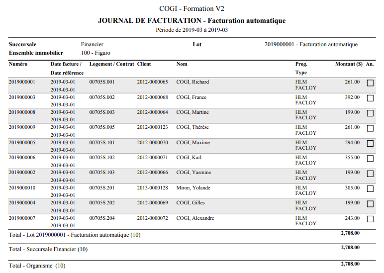 Voici un exemple de Journal de facturation généré via le traitement "Facturation automatique" :