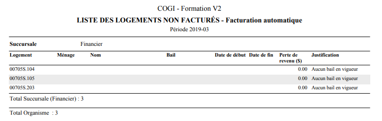 Le traitement "Facturation automatique" permet de planifier la facturation des baux pour les logements facturables. Un rapport de contrôle ainsi que des productions supplémentaires permettent de vérifier le bon déroulement du traitement (en l'occurrence, le Journal de facturation et la Liste des logements non facturés).