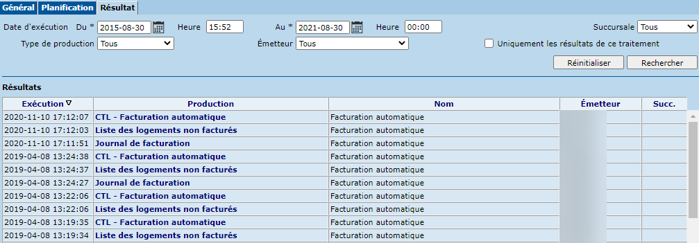 L'onglet "Résultat" affiche la liste des fichiers générés lors des planifications correspondant aux critères de sélection spécifiés au-dessus du tableau "Résultats". Ce dernier affiche la liste des rapports de contrôle (CTL), journaux de facturation (s'il y lieu) et listes des logements non-facturés (s'il y a lieu).