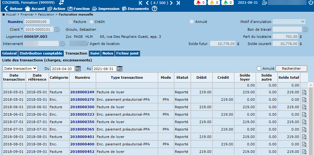 L'écran "Facturation manuelle" permet la saisie et la consultation de tous types de factures générées par le système (Régie, effets retournés, facturation automatique, etc.).