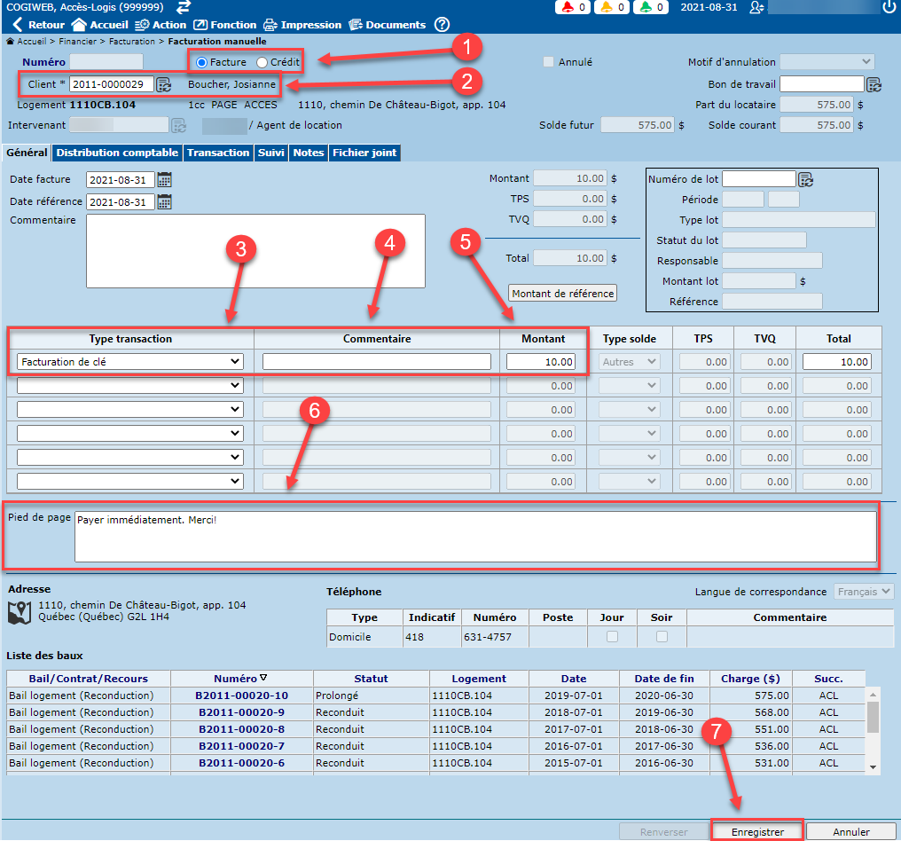 Sélectionner le type de transaction (ex. Facture de loyer, frais NSF, etc.).