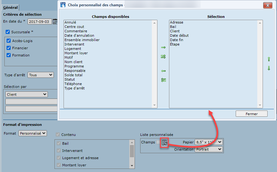 Le format personnalisé permet de définir les champs à afficher dans la liste, et offre ainsi plus de flexibilité. Pour ce faire, il suffit de cliquer sur la liste de valeurs, et déplacer les champs désirés dans la liste des champs disponibles vers la liste "Sélection" à l'aide des flèches prévues à cet effet.