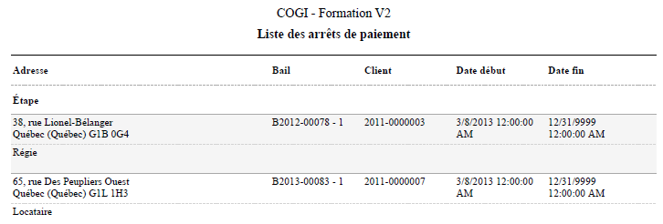 La liste des arrêts de paiement permet de regrouper les informations selon les critères suivants :