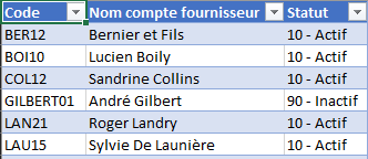 La liste des comptes fournisseurs permet de spécifier le statut actif et/ou inactif.