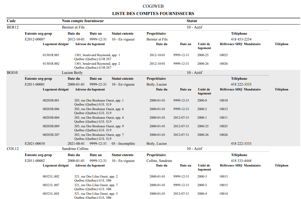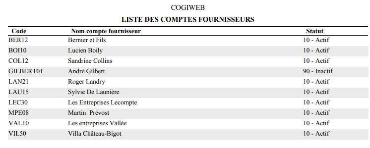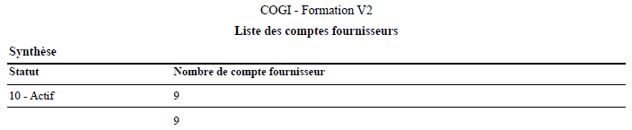 Le format sommaire fournit les informations de base pour chaque compte fournisseur.