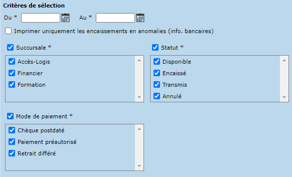 La liste des encaissements automatisés permet de spécifier les critères suivants :