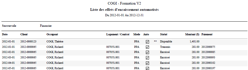 La liste des encaissements automatisés peut être imprimée en 2 formats :
