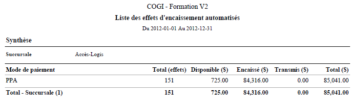 Le format sommaire fournit les informations de base pour chaque encaissement automatisé.