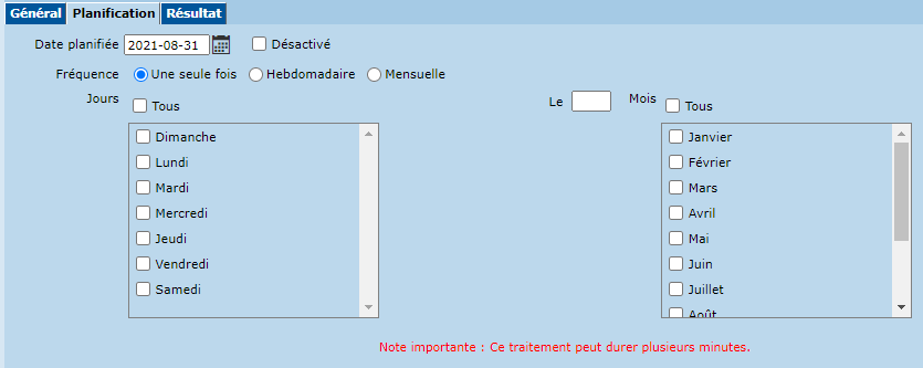 Une planification peut être désactivée en tout temps en cochant la case "Désactivé".