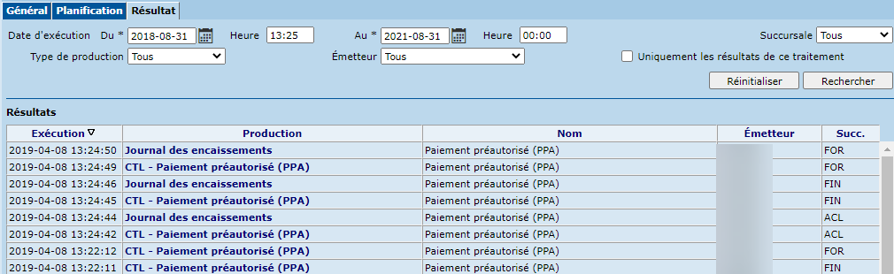 L'onglet "Résultat" affiche la liste des fichiers générés lors des planifications correspondant aux critères de sélection spécifiés au-dessus du tableau "Résultats". Ce dernier affiche la liste des rapports de contrôle (CTL) et des journaux de l'encaissement (s'il y lieu).