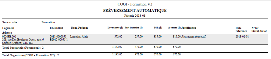 La liste "Préversement automatique" permet de consulter le détail des logements pour lesquels un versement sera effectué, ainsi que le montant total à être versé pour la période. Cette liste permet de vérifier les versements avant le traitement de ceux-ci. Par conséquent, aucune transaction n'est générée lors de la production de la liste des préversements automatiques.