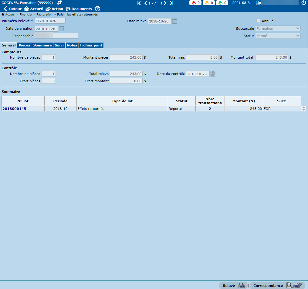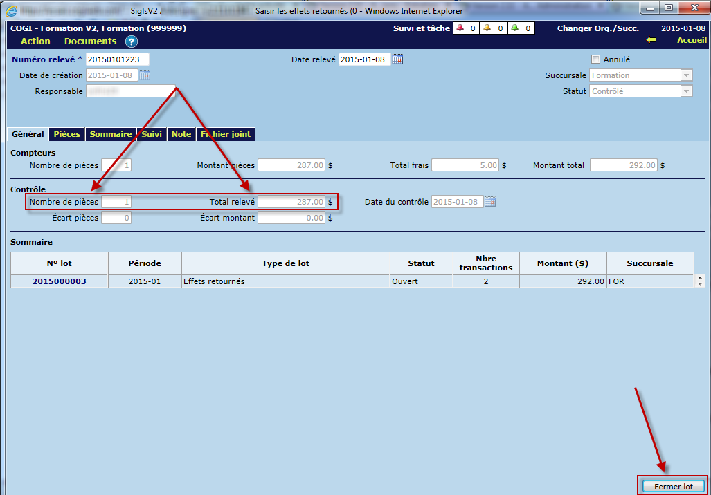 Par la suite, cliquer sur le bouton "Enregistrer". Un lot de type "Effets retournés" sera créé, de même que les factures NSF pour toutes les pièces saisies. Un bouton "Fermer lot" apparaîtra à condition que le "Nombre de pièces" et le "Total relevé" soient identiques à l'information saisie sous l'onglet "Pièces". Cliquer sur le bouton "Fermer lot".