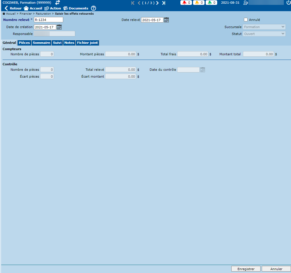 Une fois la saisie des pièces complétée, vous devez retourner sous l'onglet "Général" pour inscrire le nombre de pièces ainsi que le montant total du relevé de l'institution financière. Le montant total doit correspondre aux montants saisis sous l'onglet "Pièces".