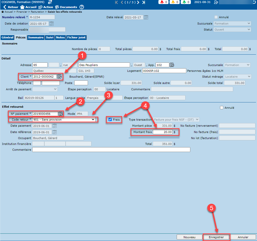 L'onglet "Pièces" permet de saisir les effets retournés par client. Les frais pour effets retournés peuvent être saisis directement à partir de cet onglet.