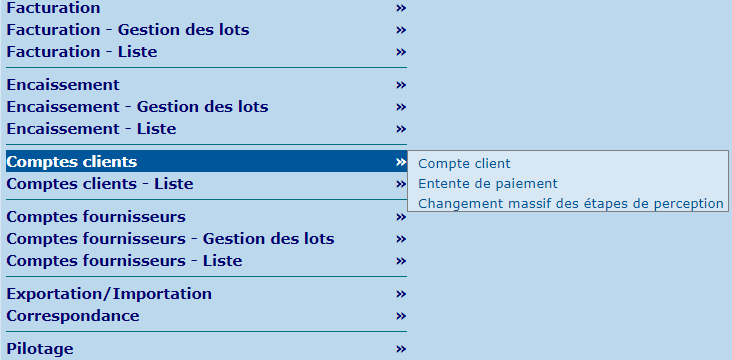 | Changement massif des étapes de perception | Permet de changer l'étape de perception d'un ou plusieurs comptes clients simultanément. |