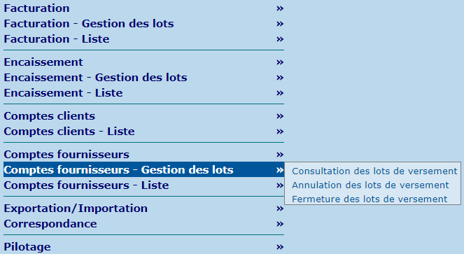 | Fermeture des lots de versement | Permet de fermer un ou plusieurs lots de versement. |