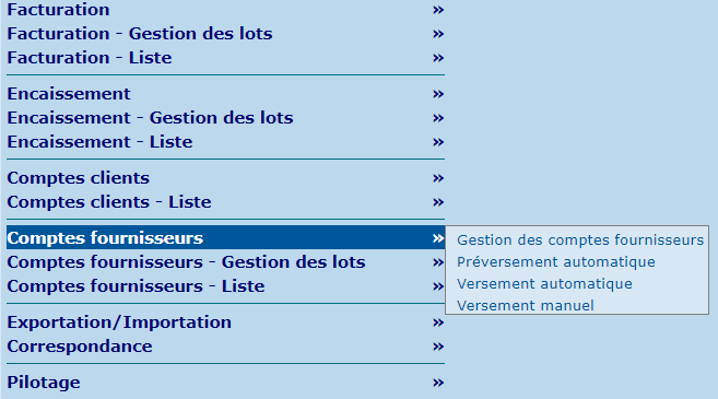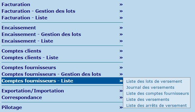 - Les comptes fournisseurs (versements, gestion des lots de versements, etc.)