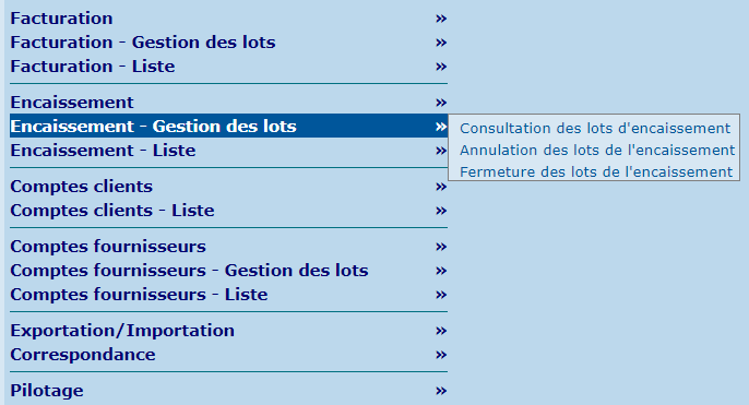 | Consultation des lots de l'encaissement | Permet de créer, modifier et consulter les lots de facturation. |