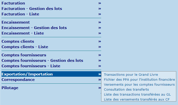 | Fichier des PPA pour l'institution financière | Permet la création du fichier des PPA (paiements pré-autorisés). Ce fichier peut être exporté à la banque. |