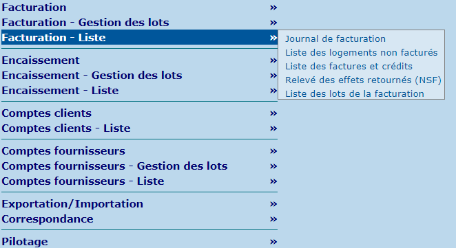 | Liste des lots de la facturation | Permet de créer des listes de lots de facturation, selon différents critères. |