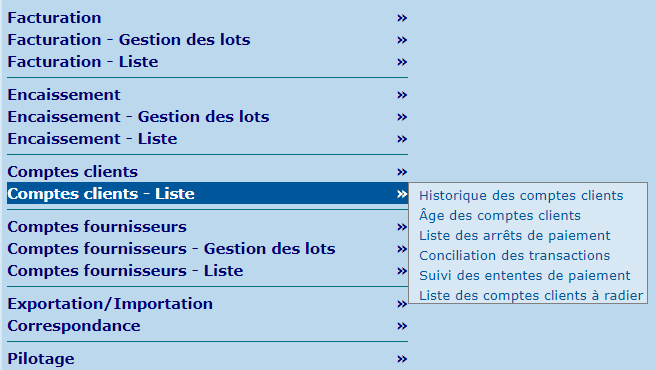 | Liste des comptes clients à radier | Permet de créer des listes de comptes à radier, selon différents critères de sélection. |