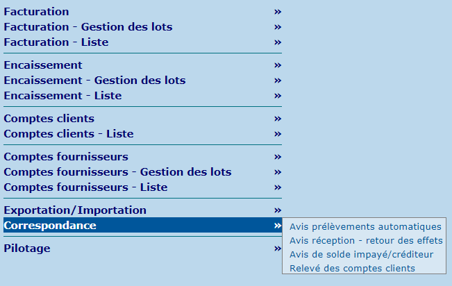 La section "Correspondance" contient une série d'écrans permettant de produire des correspondances concernant les prélèvements automatiques, les retours d'effets, les soldes impayés / créditeurs ou les relevés de comptes clients.