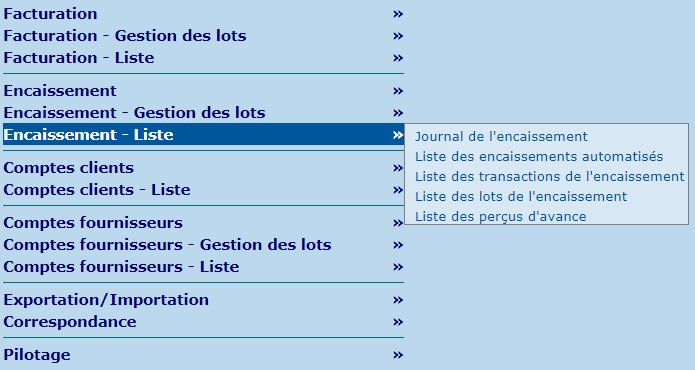 La section "Encaissement - Liste" contient une série de listes qui concernent les encaissements.