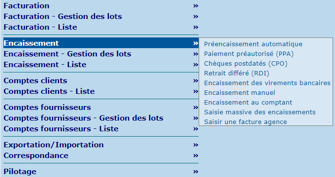 La section "Encaissement" contient les écrans permettant de gérer les encaissements de tous types (paiements préautorisés, chèques postdatés, encaissements manuels, etc.).