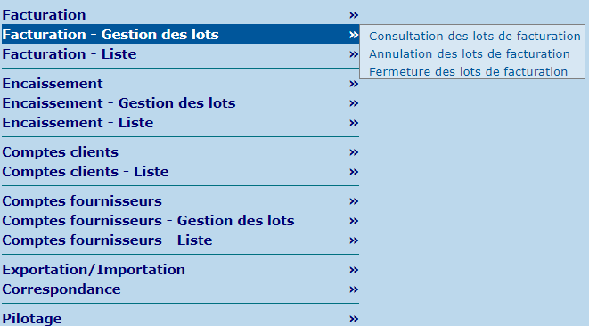 | Consultation des lots de facturation | Permet de créer, modifier et consulter les lots de facturation. |