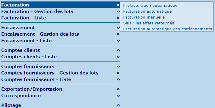 La section "Facturation" contient les écrans permettant de gérer la facturation manuelle et automatique, ainsi que les effets retournés.