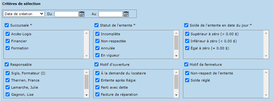 Le suivi des ententes de paiement permet de spécifier les critères suivants :