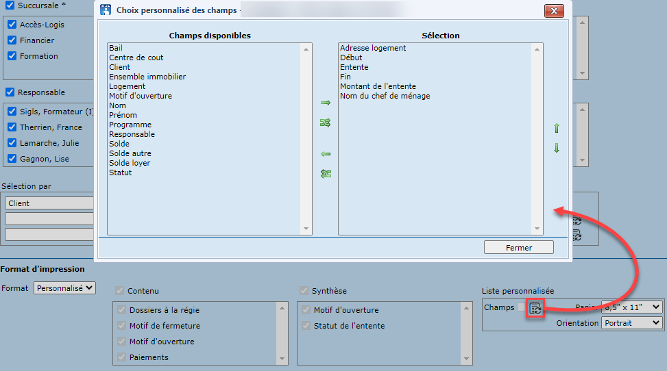 Le format personnalisé permet de définir les champs à afficher dans la liste, et offre ainsi plus de flexibilité. Pour ce faire, il suffit de cliquer sur la liste de valeurs, et déplacer les champs désirés dans la liste des champs disponibles vers la liste "Sélection" à l'aide des flèches prévues à cet effet.