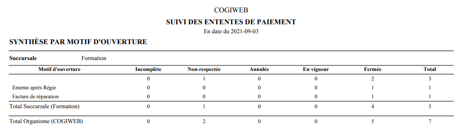 Le format synthèse présente un résumé des informations par statut de l'entente ou par motif d'ouverture.