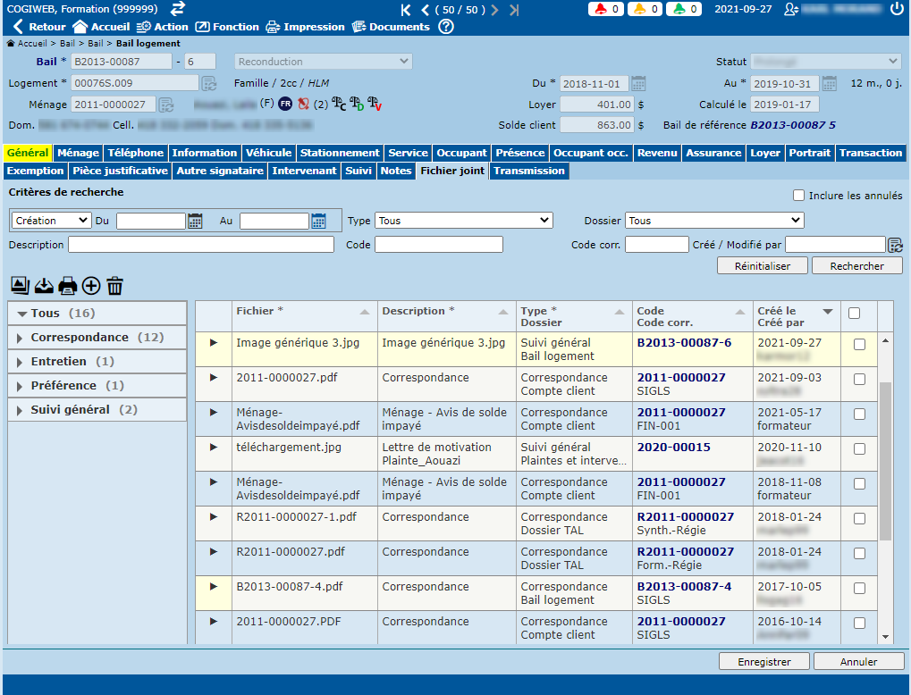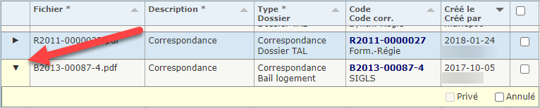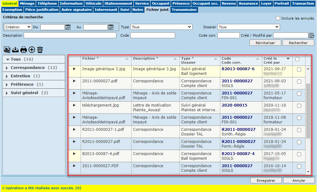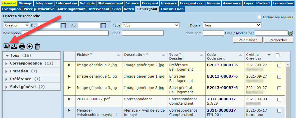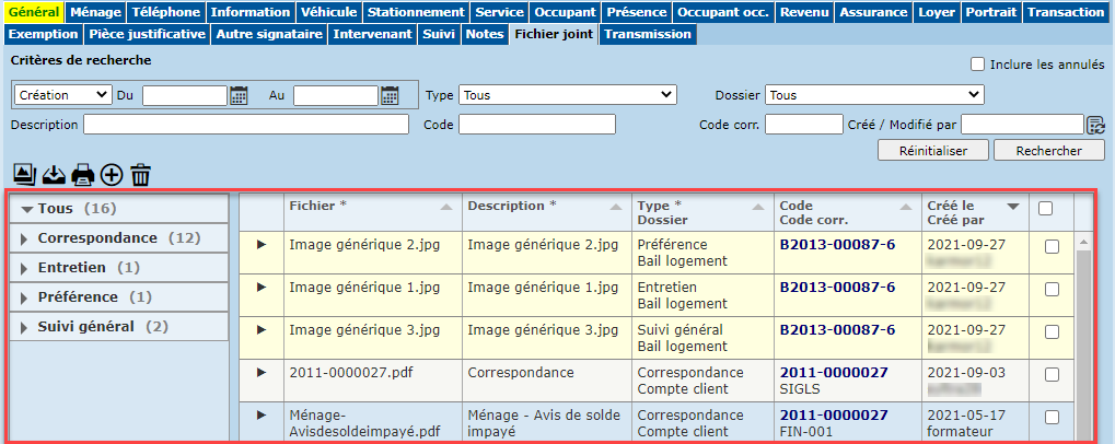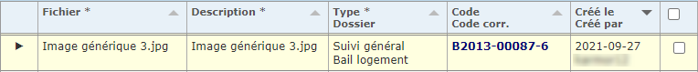 Pour accéder au dossier associé au fichier joint (ménage, demande, bail, etc.), cliquer sur l'hyperlien correspondant dans la colonne "Code / Code corr.".