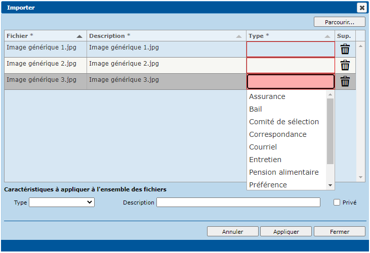 - Si vous appliquez le même "Type" et/ou la même description à tous les fichiers, il suffit de compléter la section "Caractéristiques à appliquer à l'ensemble des fichiers" et cliquer sur le bouton "Appliquer";