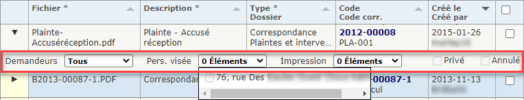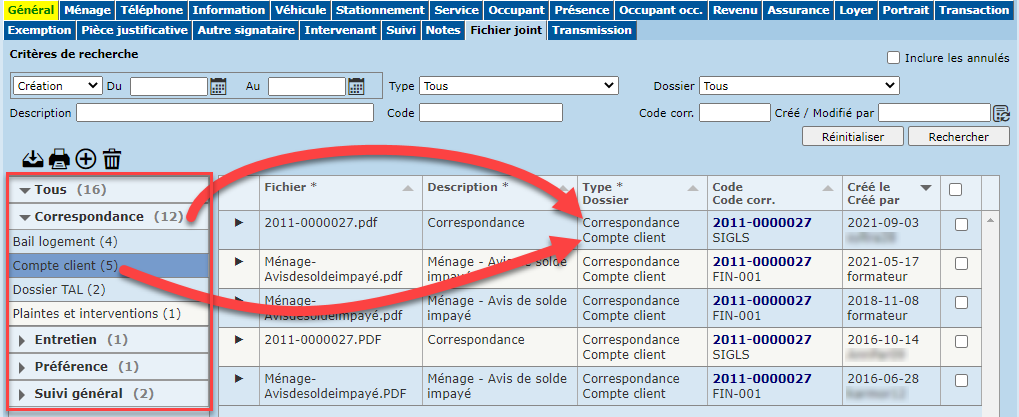 Dans l'exemple ci-haut, le filtre est appliqué sur le type de fichier joint "Correspondance" et le type de dossier "Compte client".