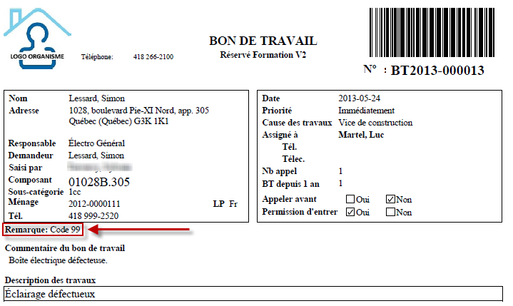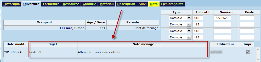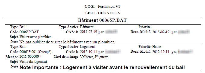 Pour des raisons de confidentialité, seul le sujet de la note s'affiche sur le bon de travail pour les notes associées aux types de dossier "Ménage", "Demande" et "Bail". Cela permet d'utiliser des codes servant à désigner des situations particulières concernant un ménage (ex. personne violente).