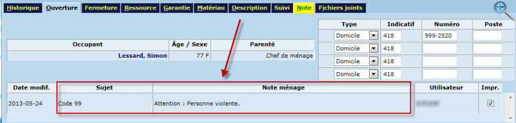L'onglet "Note" est disponible dans la plupart des écrans de mise à jour. Lorsqu'une note est présente, la couleur de l'onglet varie selon la priorité de celle-ci.