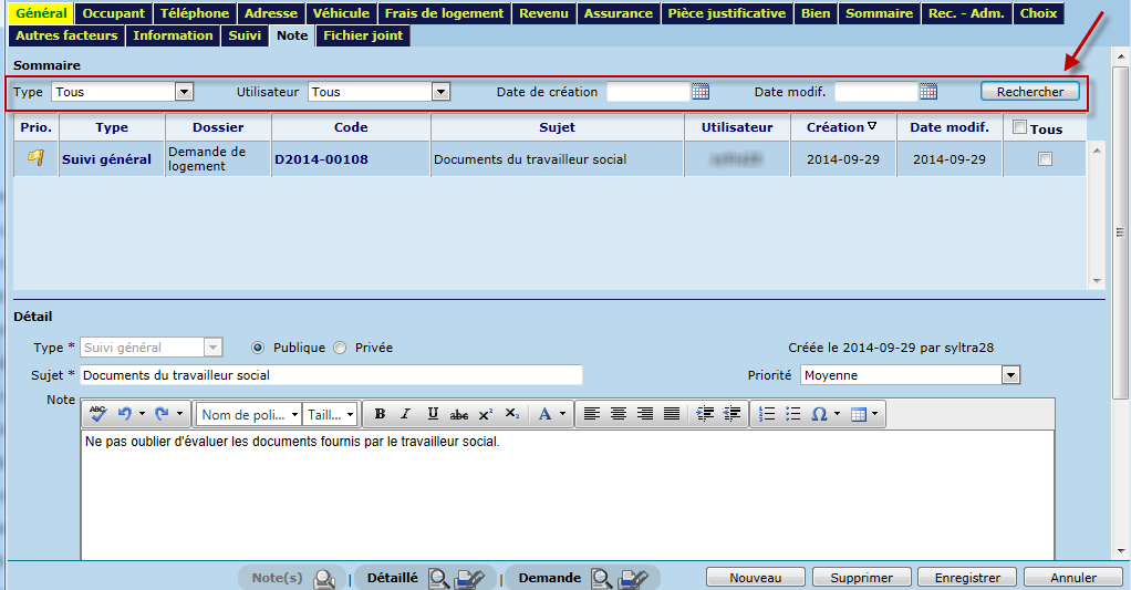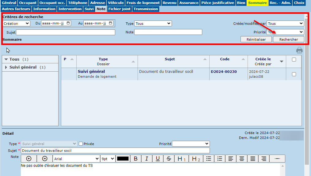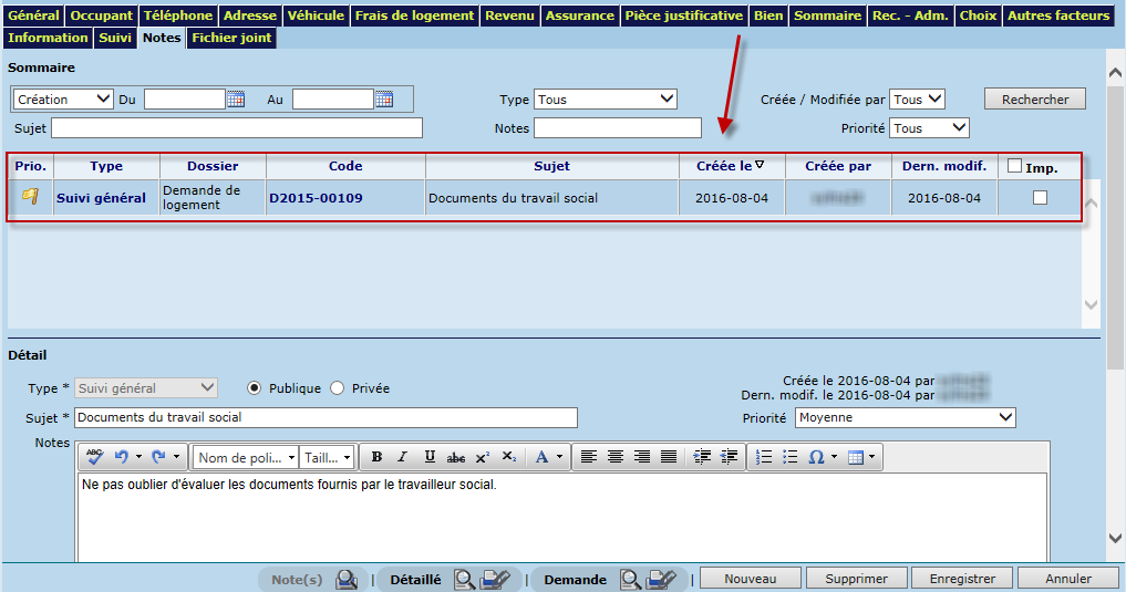 Cette section permet de visualiser les notes inscrites au dossier dans un tableau, selon les critères de recherche définis . Les notes sont présentées en ordre de priorité et date de création. Il est possible de modifier l'ordre de tri en cliquant sur l'en-tête d'une colonne.