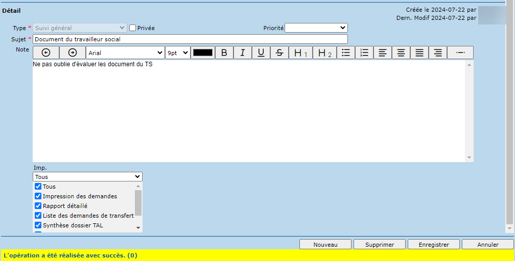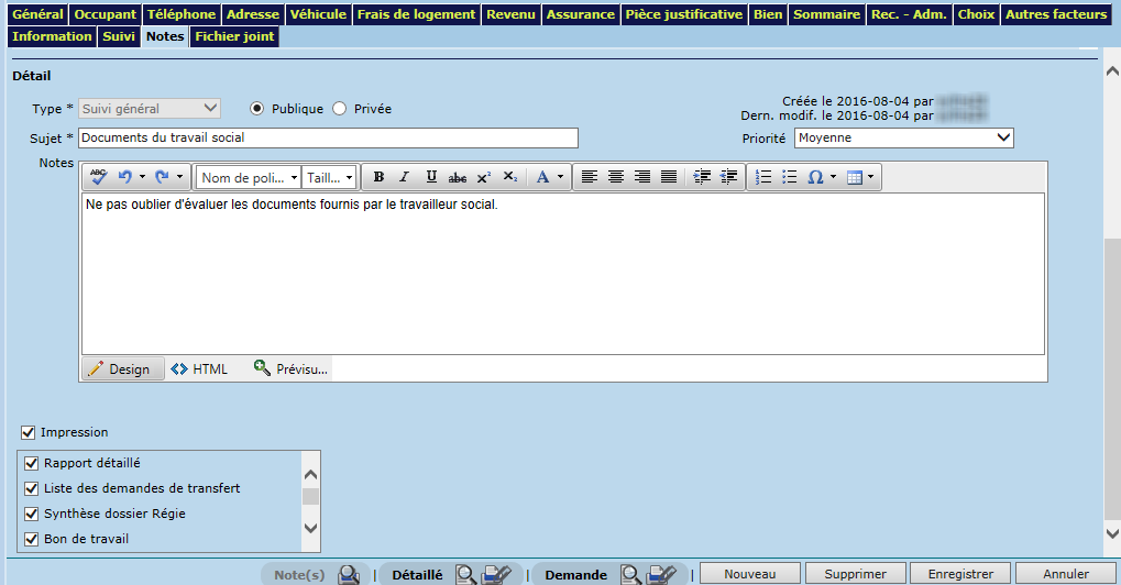 Cette section permet de consulter, créer, modifier, supprimer et imprimer des notes inscrites au dossier. Une note doit comprendre un type (obligatoire), un sujet (obligatoire), une priorité, la description de la note et les options d'impression (c'est-à-dire, les dossiers où la note sera affichée et à partir desquels celle-ci pourra être imprimée).