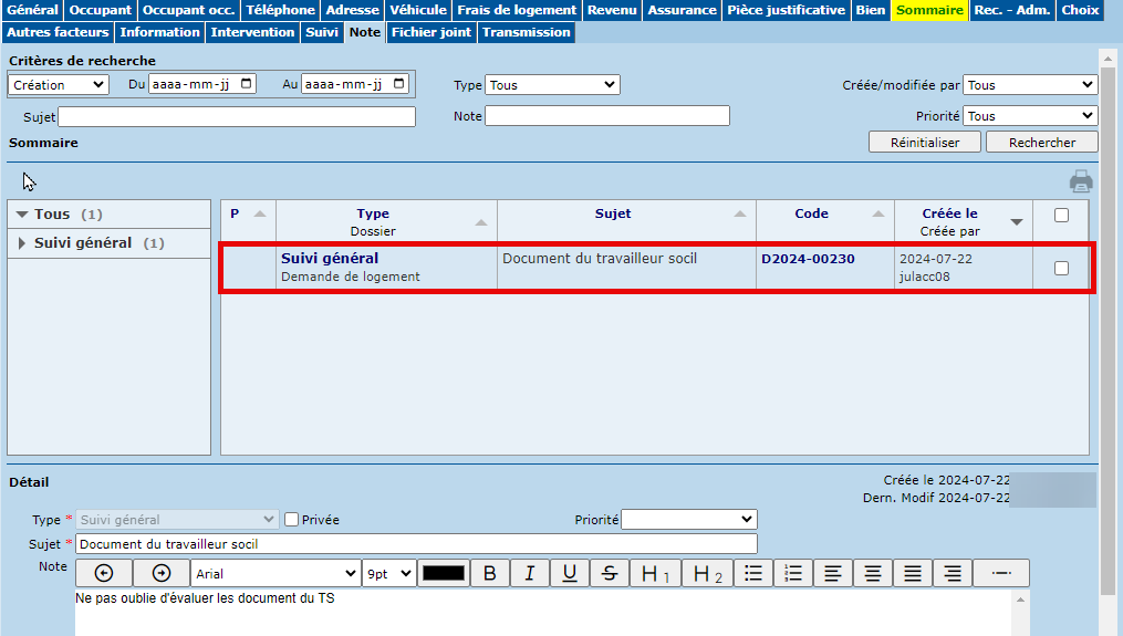 L'onglet "Note" est présent dans plusieurs écrans du SIGLS. Cet onglet permet de consulter, inscrire et modifier des notes dans le dossier traité.