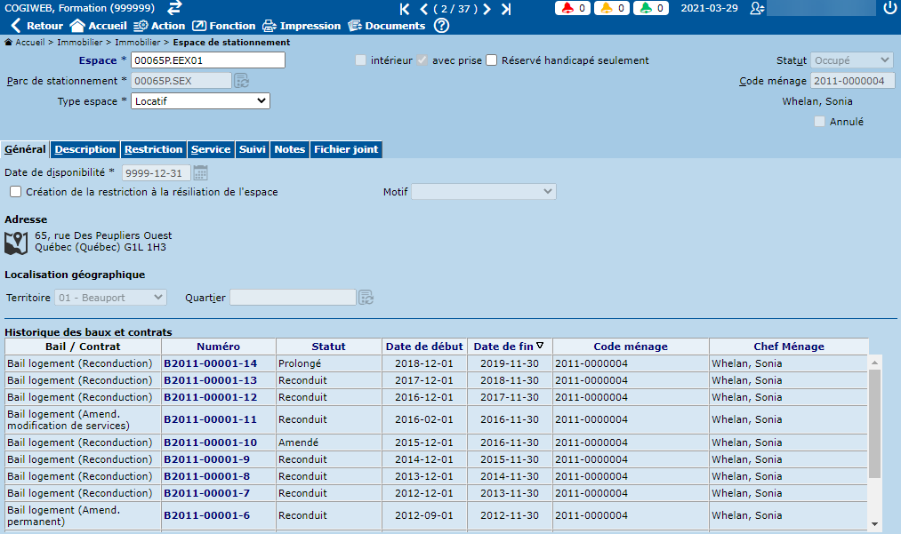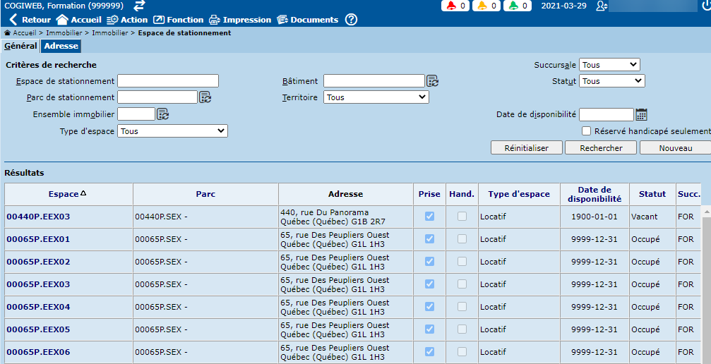 Il est possible de rechercher un espace de stationnement selon des critères généraux sous "Immobilier -> Immobilier -> Espace de stationnement". L'onglet "Adresse" permet de rechercher un espace de stationnement selon les informations relatives à une adresse (recherche par code postal, par rue, par territoire, etc.).