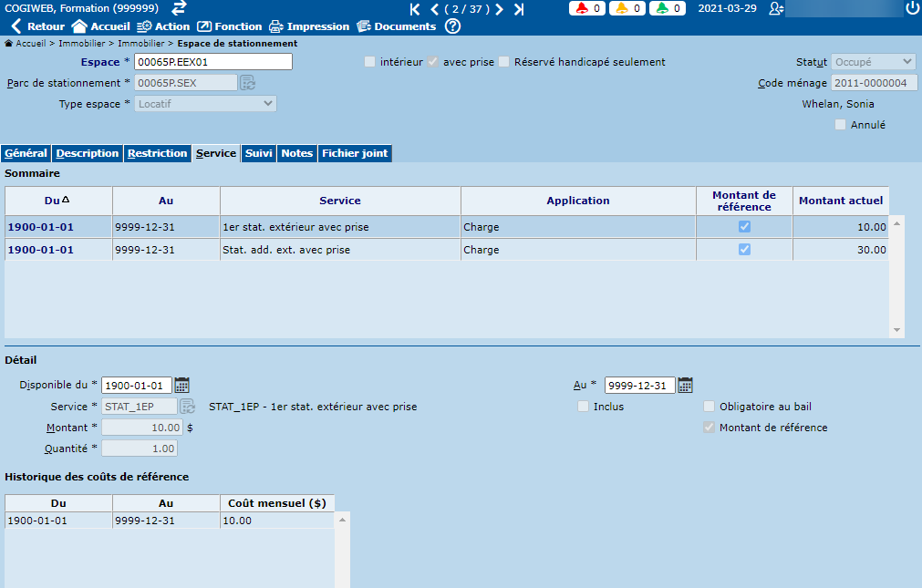 L'onglet "Service" permet de consulter et d'associer des services (ex. prise électrique), ainsi que leur coût mensuel, à l'espace de stationnement. À noter que les services ont un impact sur le coût du loyer.