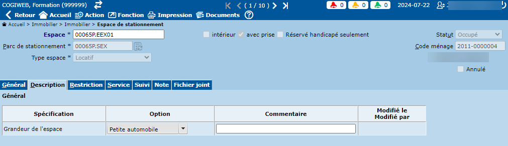 L'onglet "Général" présente les informations générales de l'espace de stationnement.