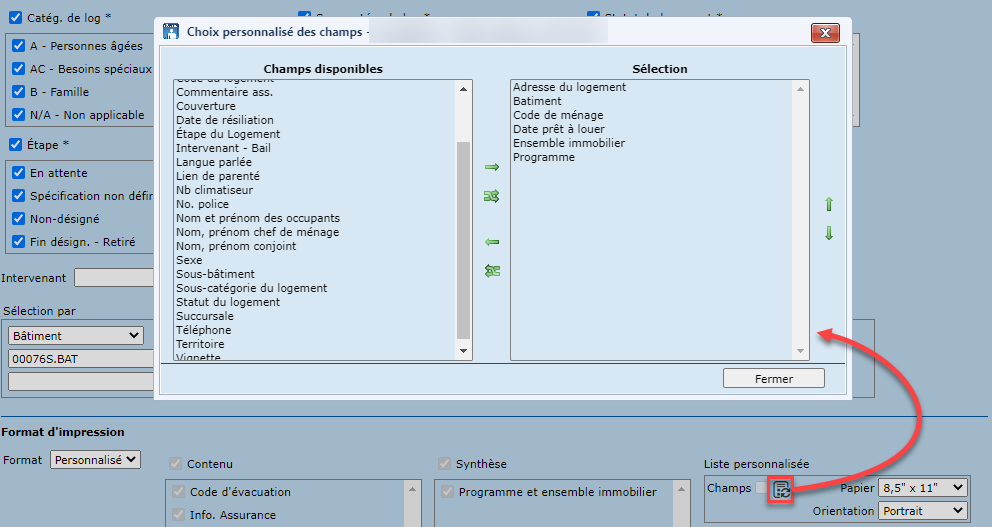Le format personnalisé permet de définir les champs à afficher dans la liste, et offre ainsi plus de flexibilité. Pour ce faire, il suffit de cliquer sur la liste de valeurs, et déplacer les champs désirés dans la liste des champs disponibles vers la liste "Sélection" à l'aide des flèches prévues à cet effet.