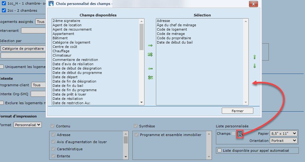 Le format personnalisé permet de définir les champs à afficher dans la liste, et offre ainsi plus de flexibilité. Pour ce faire, il suffit de cliquer sur la liste de valeurs, et déplacer les champs désirés dans la liste des champs disponibles vers la liste "Sélection" à l'aide des flèches prévues à cet effet.